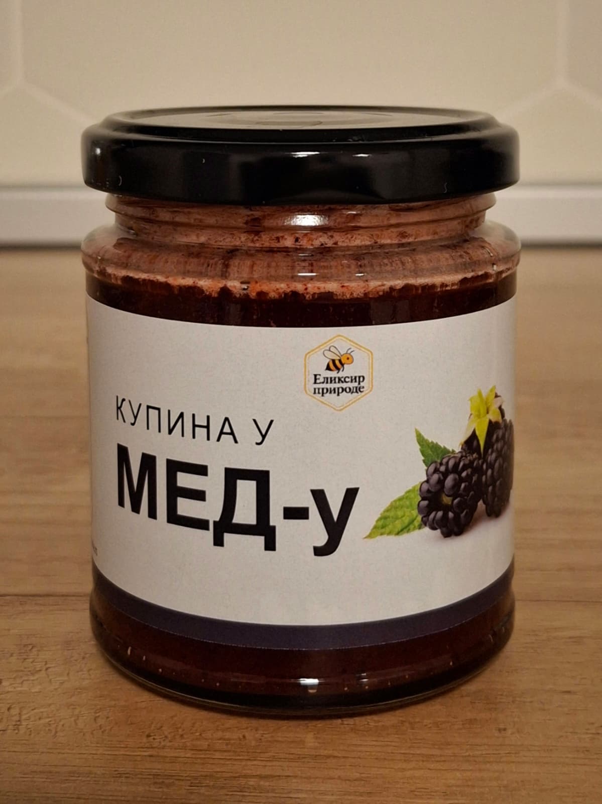 Мед са додатком лиофилизоване купине у праху доноси интензивну воћну арому и благу киселкасту свежину која савршено употпуњује његов укус. Богат антиоксидансима, витаминима и минералима, овај производ је здрава и укусна посластица која освежава и даје енергију. Његова кремаста структура и јединствена воћна нота чине га идеалним намазом, додатком десертима или као природни енергетски залогај.
